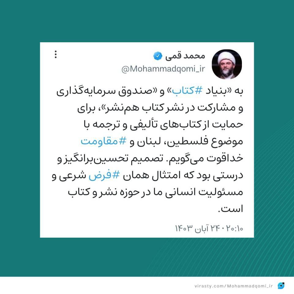 به «بنیاد کتاب» و «صندوق سرمایه‌گذاری و مشارکت در نشر کتاب هم‌نشر» برای حمایت از کتاب‌های تآلیفی و ترجمه با موضوع فلسطین، لبنان و مقاومت خدا قوت می‌گویم. تصمیم تحسین‌برانگیز و درستی بود که امتثال همان فرض شرعی و مسئولیت انسانی ما در حوزه نشر و کتاب است.