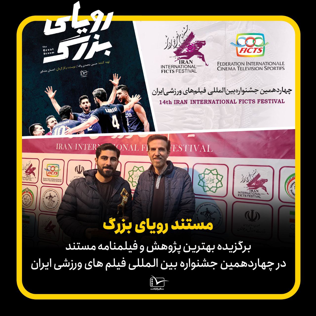 مستند «رویای بزرگ» در بخش جوایز افتتاحیه جشنواره بینالمللی فیلمهای ورزشی ایران برگزیده بهترین پژوهش و فیلمنامه مستند در بخش روح المپیک شد.