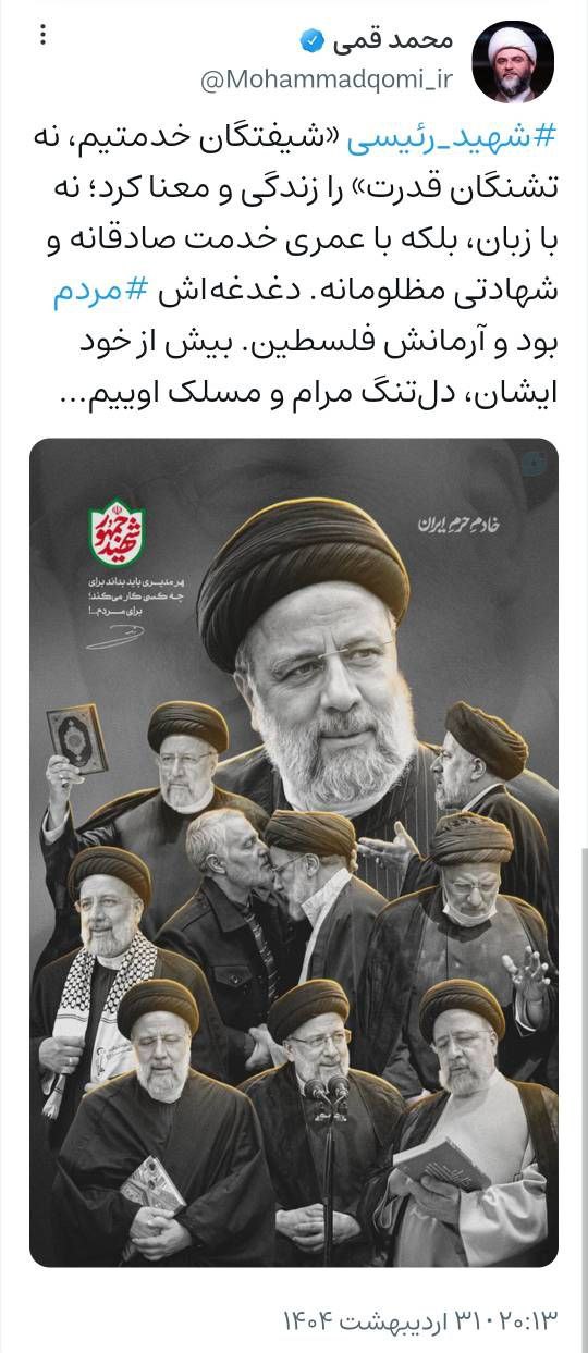 به گزارش روابط عمومی سازمان تبلیغات اسلامی، حجت‌الاسلام محمد قمی، رئیس سازمان تبلیغات اسلامی در سالگرد شهادت سید ابراهیم رئیسی در صفحه شخصی خود در شبکه ویراستی نوشت؛  شهید رئیسی «شیفتگان خدمتیم، نه تشنگان قدرت» را زندگی و معنا کرد؛ نه با زبان، بلکه با عمری خدمت صادقانه و شهادتی مظلومانه. دغدغه‌اش مردم بود و آرمانش فلسطین. بیش از خود ایشان، دل‌تنگ مرام و مسلک اوییم..