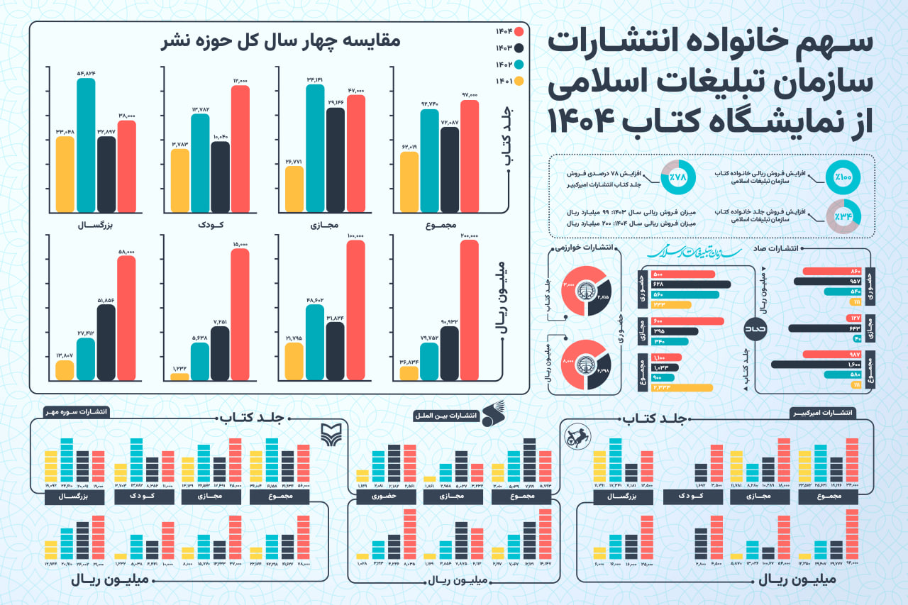 به گزارش روابط عمومی سازمان تبلیغات اسلامی، مجدالدین معلمی، مدیرعامل بنیاد کتاب، گفت: «خانواده نشر سازمان تبلیغات اسلامی در نمایشگاه کتاب ۱۴۰۴، با فروش ۹۷ هزار جلد کتاب، رشد ۳۴ درصدی در فروش تعداد جلد کتاب را نسبت به سال گذشته تجربه کرد. فروش ریالی خانواده نشر سازمان تبلیغات اسلامی نیز با رشد ۱۰۰ درصدی معادل ۲۰ میلیارد تومان بود.»