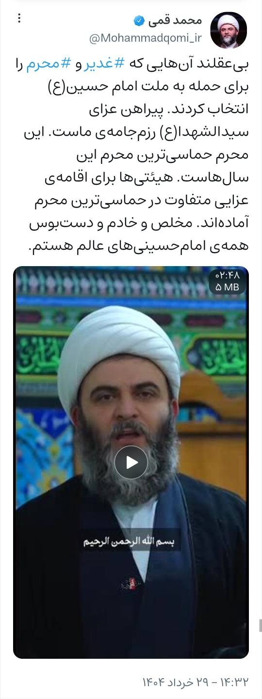 بیعقلند آنهایی که غدیر و محرم را برای حمله به ملت امام حسین(ع) انتخاب کردند. پیراهن عزای سیدالشهدا(ع) رزمجامهی ماست. این محرم حماسیترین محرم این سالهاست. هیئتیها برای اقامهی عزایی متفاوت در حماسیترین محرم آمادهاند. مخلص و خادم و دستبوس همهی امامحسینیهای عالم هستم.