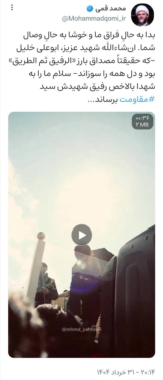 به گزارش روابط عمومی سازمان تبلیغات اسلامی، حجت‌الاسلام محمد قمی، رئیس سازمان تبلیغات اسلامی، در پی اعلام خبر شهادت «ابوعلی خلیل»، یار همیشگی سید شهدای مقاومت که روح‌ بلندش به مراد خود پیوست، با انتشار ویدئویی از این شهید عزیز در صفحه شخصی خود نوشت: