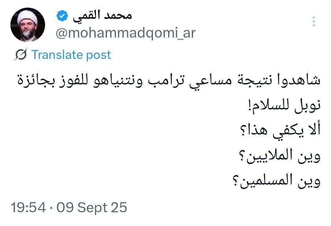 ۱۸ شهریور | حجت‌الاسلام قمی در واکنش به حمله اسرائیل به قطر نوشت؛