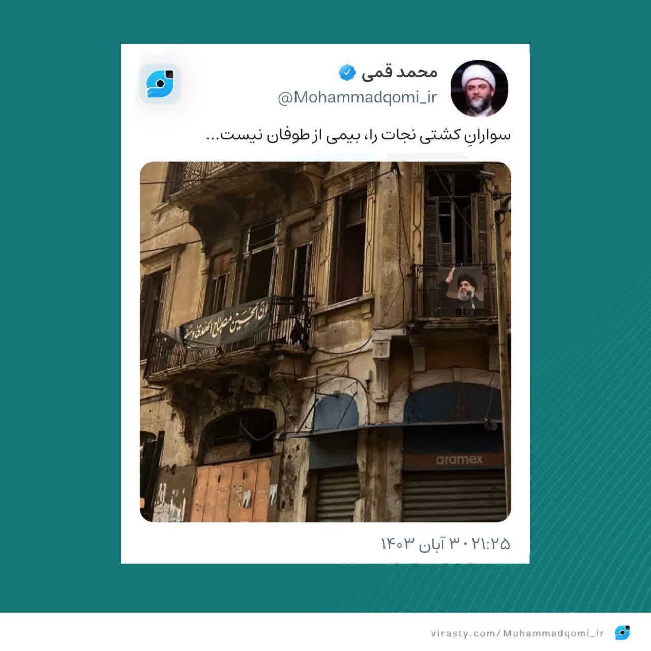 رئیس سازمان تبلیغات اسلامی درباره حال و هوای این روزهای لبنان عکسی از ساختمانی که تصویر سید حسن نصرالله بر آن نقش بسته بود منتشر کرد.