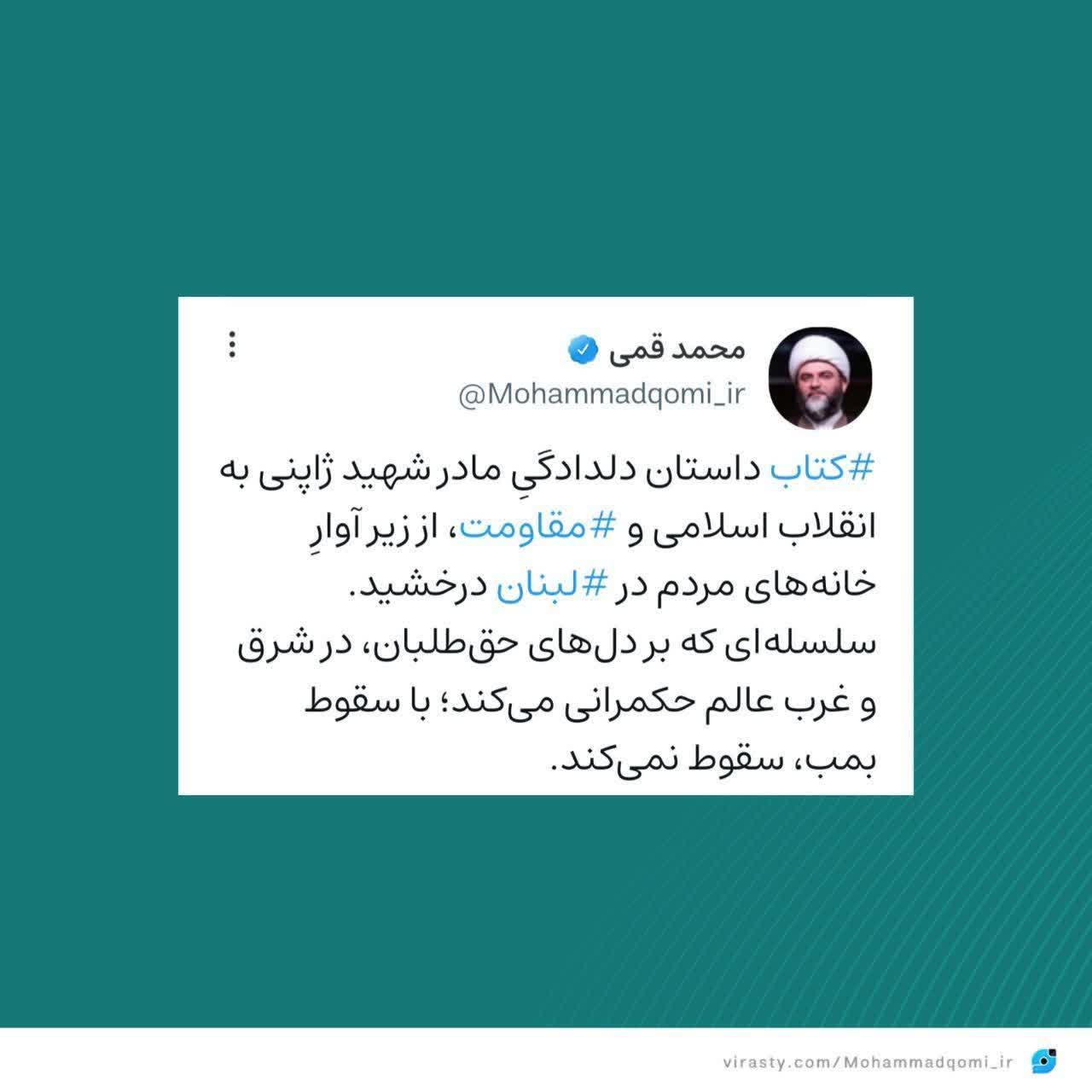 به گزارش روابط عمومی سازمان تبلیغات اسلامی حجتالاسلام قمی، رئیس سازمان تبلیغات اسلامی، در واکنش به یافتن ترجمه عربی کتاب مهاجر سرزمین آفتاب زیر آوار خانههای مردم لبنان، در صفحه شخصی خود نوشت: