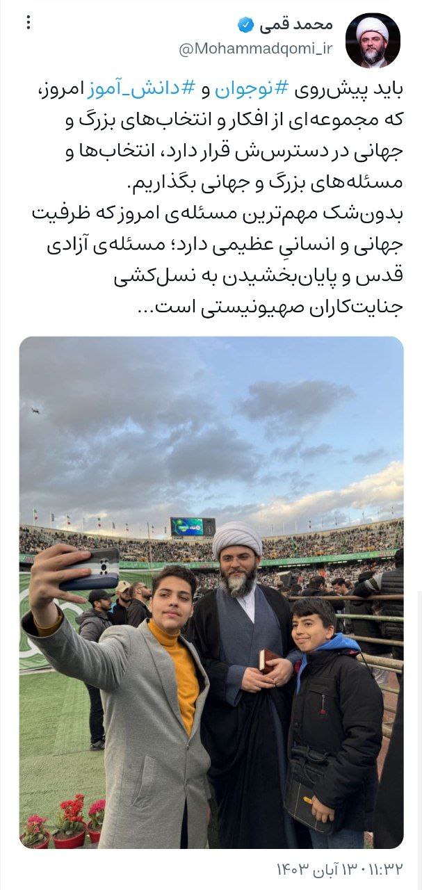 به گزارش روابط عمومی سازمان تبلیغات اسلامی، حجتالاسلام قمی، رئیس سازمان تبلیغات اسلامی، همزمان با روز مبارزه با استکبار جهانی و روز دانشآموز، با انتشار تصویری از نوجوانان در حاشیهی مراسم صدوبیستهزارنفری محفل امامحسنیها در صفحه شخصی خود نوشت: