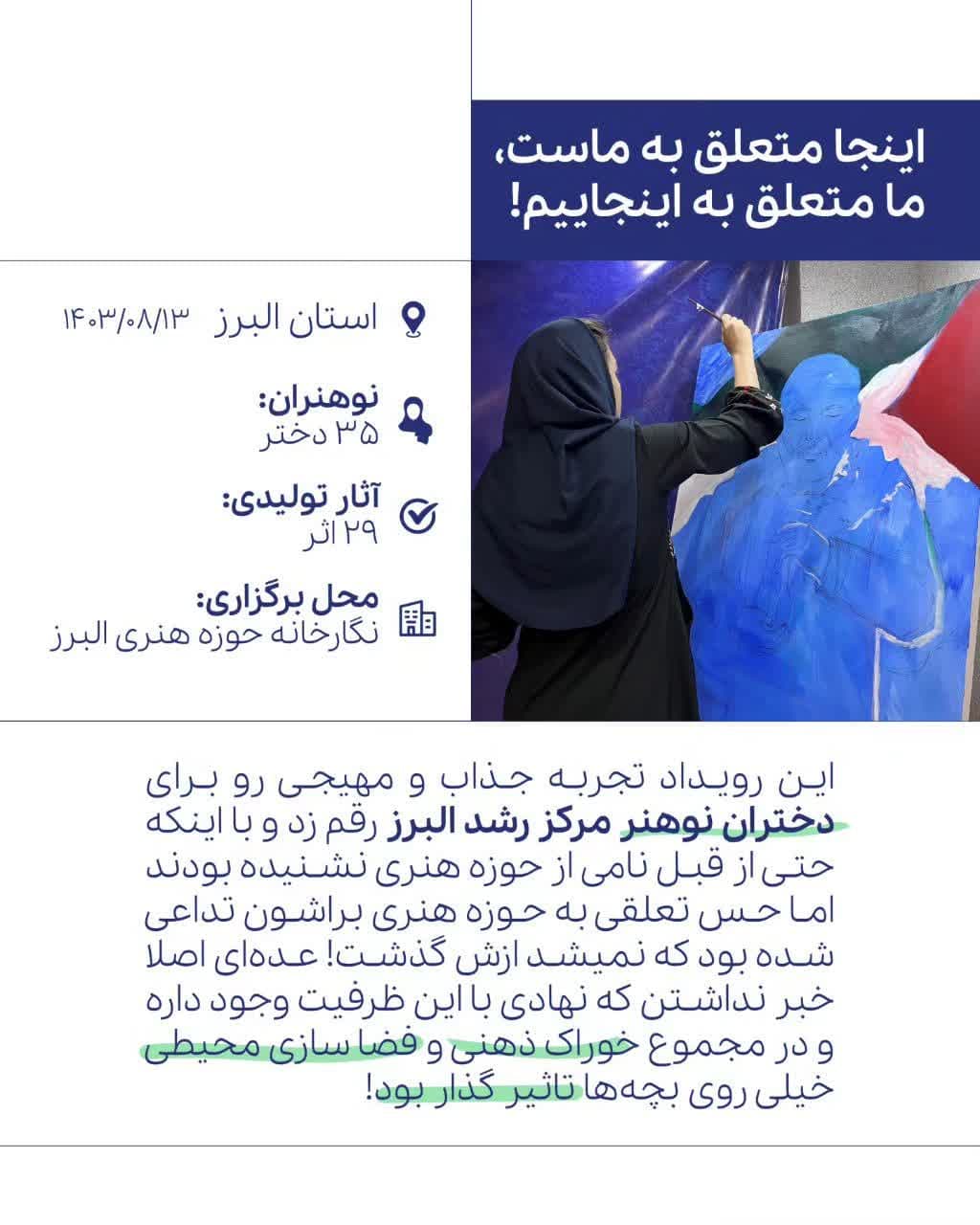 این پویش به همت مرکز هنرهای تجسمی حوزه هنری، واحد امور بین الملل حوزه هنری، مرکز رشد نوجوان امید و باشگاههای رشد نوجوان حوزه هنری در این استانها برگزار شد.