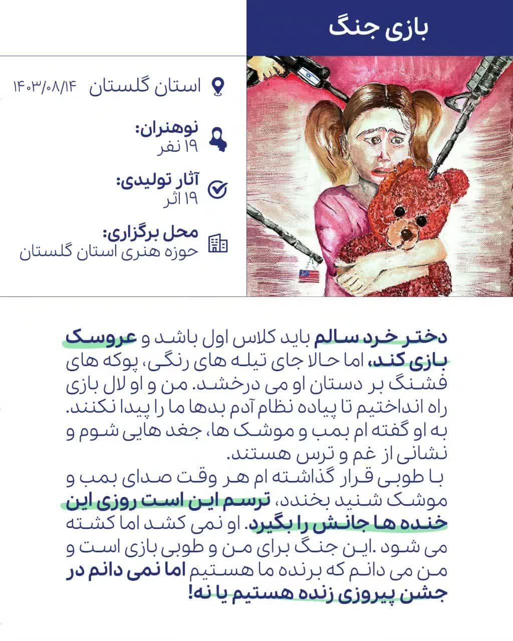 این رویداد با سازماندهی مرکز رشد امید، با همراهی گروهی از نوهنران مراکز رشد امید با موضوع گرامیداشت قهرمانان و شهدای محور مقاومت و بر مبنای دغدغههای جمعی در 7 استان برگزار شد.