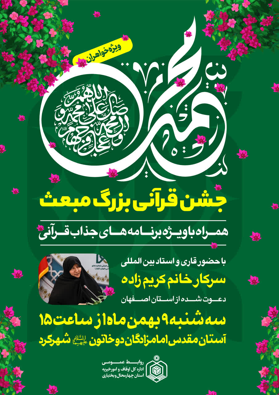 «جشن قرآنی مبعث» ویژه بانوان در روز بعثت پیامبر نور و رحمت حضرت محمد مصطفی(ص) در آستان مقدس امامزادگان حلیمه و حکیمه خاتون(س) شهرکرد برگزار میشود.