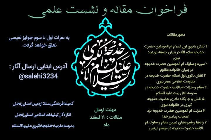کمیته فرهنگی ستاد اربعین استان زنجان با همکاری اداره کل تبلیغات اسلامی استان زنجان و مدرسه علمیه خدیجه کبری علیها السلام، فراخوان مقاله و نشست علمی - پژوهشی در مورد مقام شاخص حضرت خدیجه سلام الله علیها را برگزار میکند.