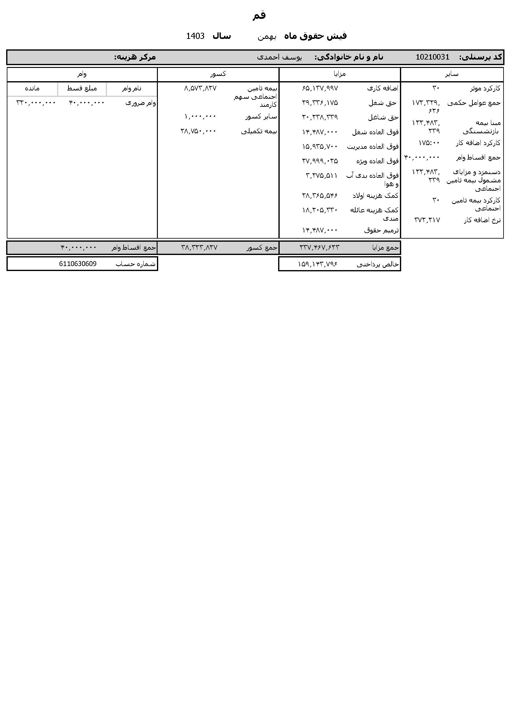 به گزارش روابط عمومی سازمان تبلیغات اسلامی، حقوق عمومی اطلاعات حقوق و مزایای 12 ماهه حجت الاسلام والمسلمین مرتضی شعبانزاده مدیر کل تبلیغات اسلامی استان قم و فیش حقوقی 12 ماهه حجت الاسلام والمسلمین یوسف احمدی معاون اداری و مالی منتشر شد.
