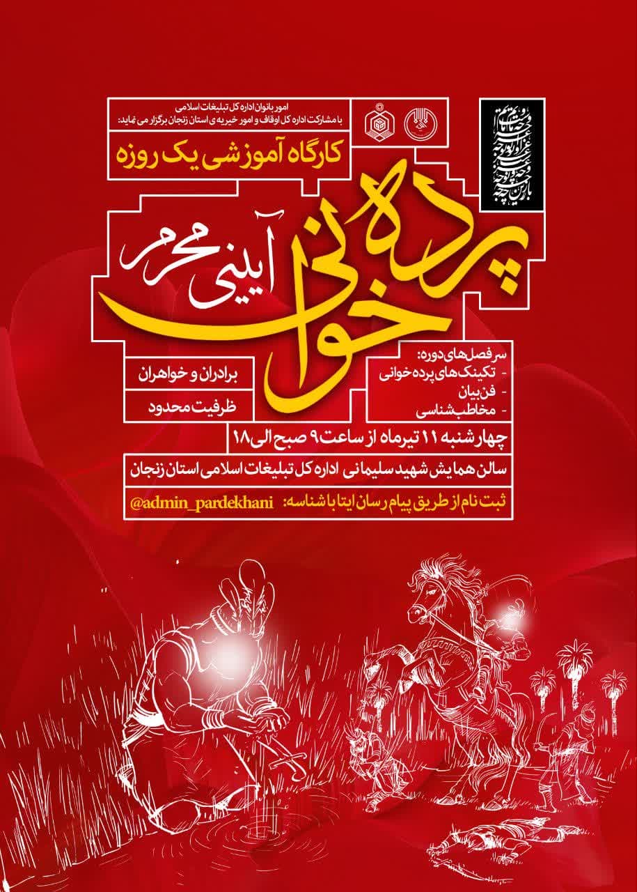 به گزارش روابط عمومی سازمان تبلیغات اسلامی، کریمی مسئول امور بانوان اداره کل تبلیغات اسلامی استان زنجان با اعلام این خبر اظهار داشت: «در آستانه فرارسیدن ماه محرم و با هدف احیای هنرهای اصیل آیینی و مذهبی، کارگاه آموزشی پردهخوانی آیینی با حضور اساتید برجسته این حوزه برگزار میشود.»