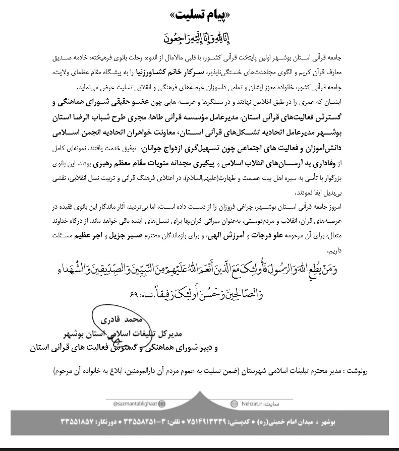 امروز جامعه قرآنی استان بوشهر، چراغی فروزان را از دست داده است، اما بیتردید، آثار ماندگار این بانوی فقیده در عرصههای قرآن، انقلاب و مردمدوستی، بهعنوان میراثی گرانبها برای نسلهای آینده باقی خواهد ماند. از درگاه خداوند متعال، برای آن مرحومه علو درجات و آمرزش الهی، و برای بازماندگان محترم صبر جزیل و اجر عظیم مسئلت داریم.