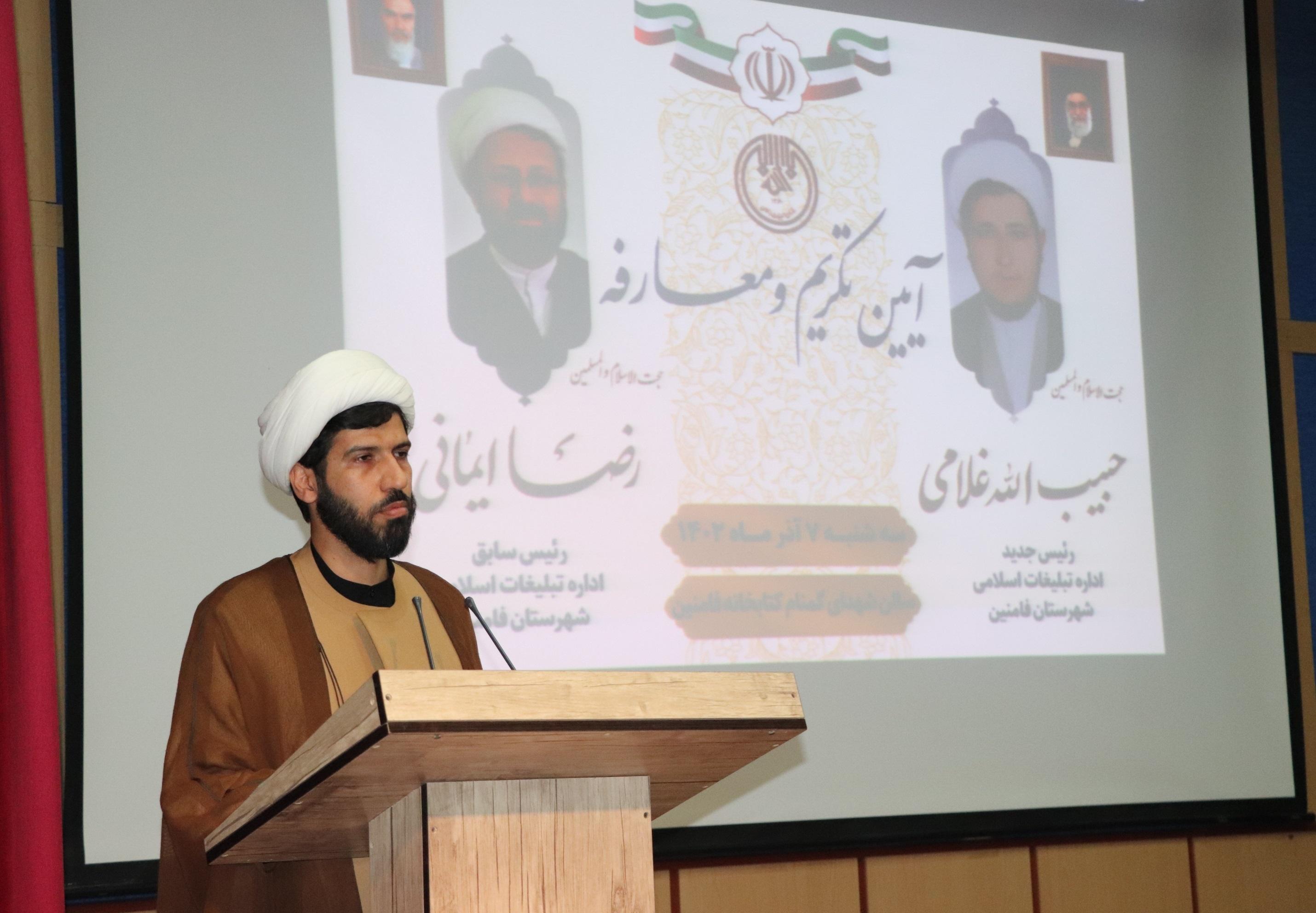 گفتنی است در پایان این مراسم از زحمات حجت الاسلام رضا ایمانی مدیر اسبق اداره تقدیر و حجت الاسلام حبیب اله غلامی به عنوان سرپرست اداره تبلیغات اسلامی شهرستان فامنین با حضور امام جمعه محترم شهرستان، فرماندار، مدیران نظامی و دستگاههای اجرایی منصوب شد.
